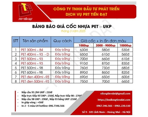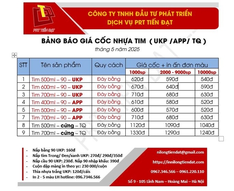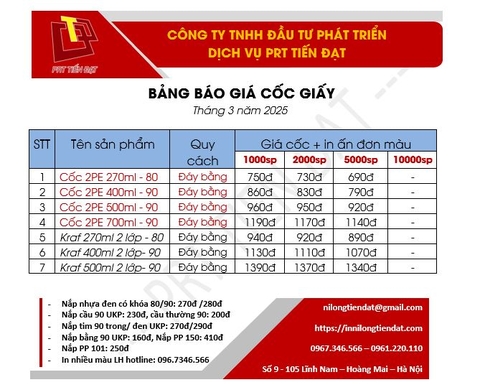 Lưu ý : - Bảng báo giá đã bao gồm cốc và in nội dung 1 màu